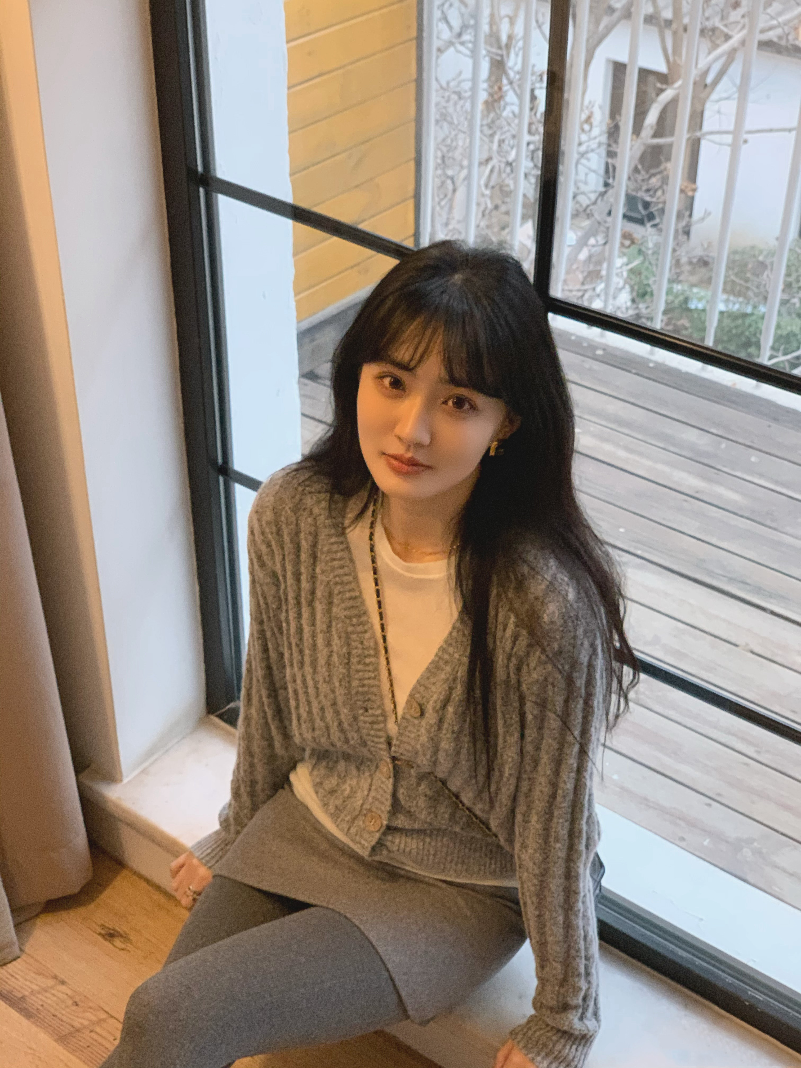 徐璐身穿冬季包身剪裁的短裙,搭配厚灰色裤袜与长外套,整体造型简洁利落,裤袜勾勒出利落线条感,在保暖与风格之间取得平衡。