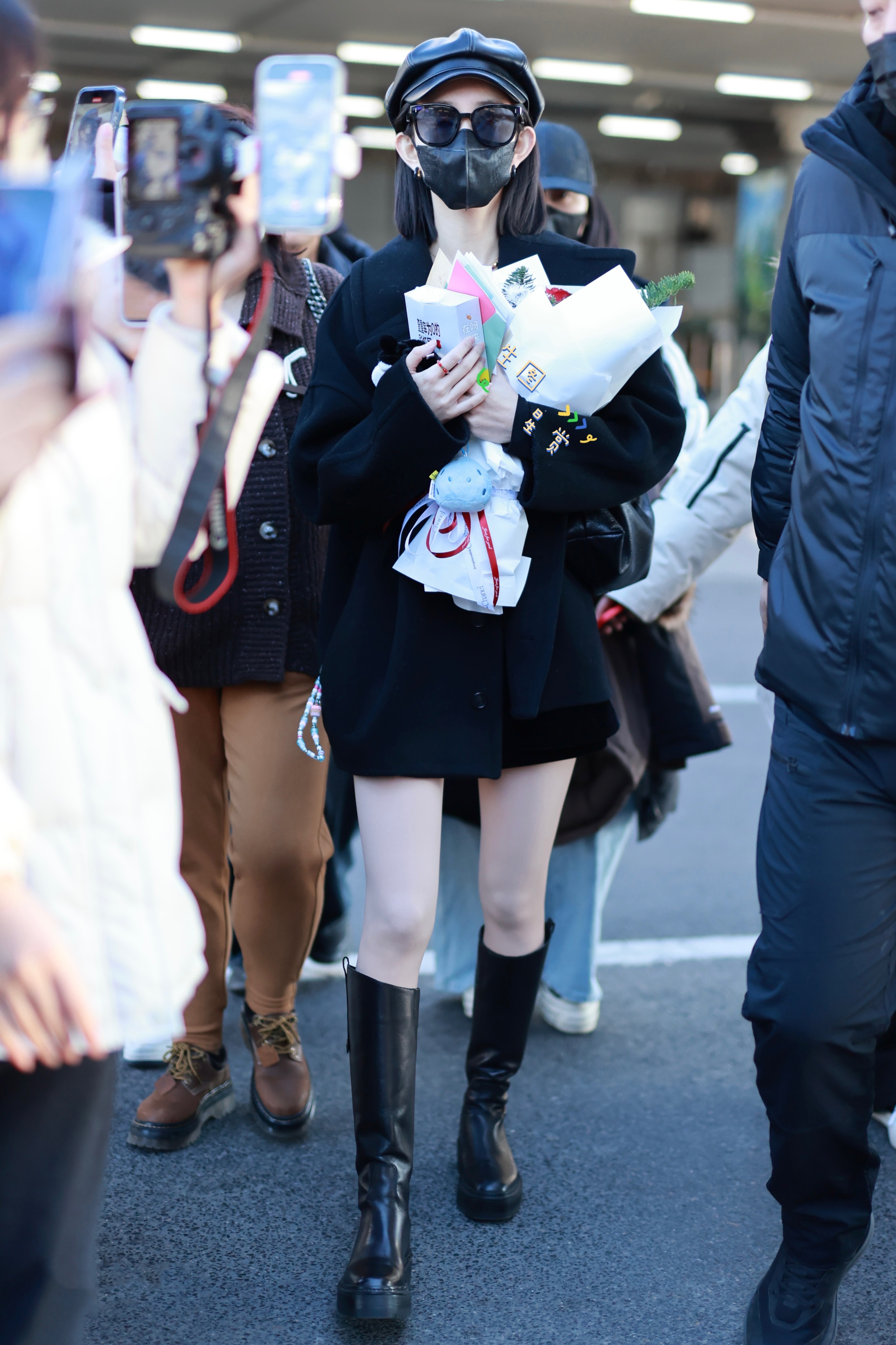 孟子义以丝袜搭配长筒靴造型亮相,展现其时尚穿搭风格。