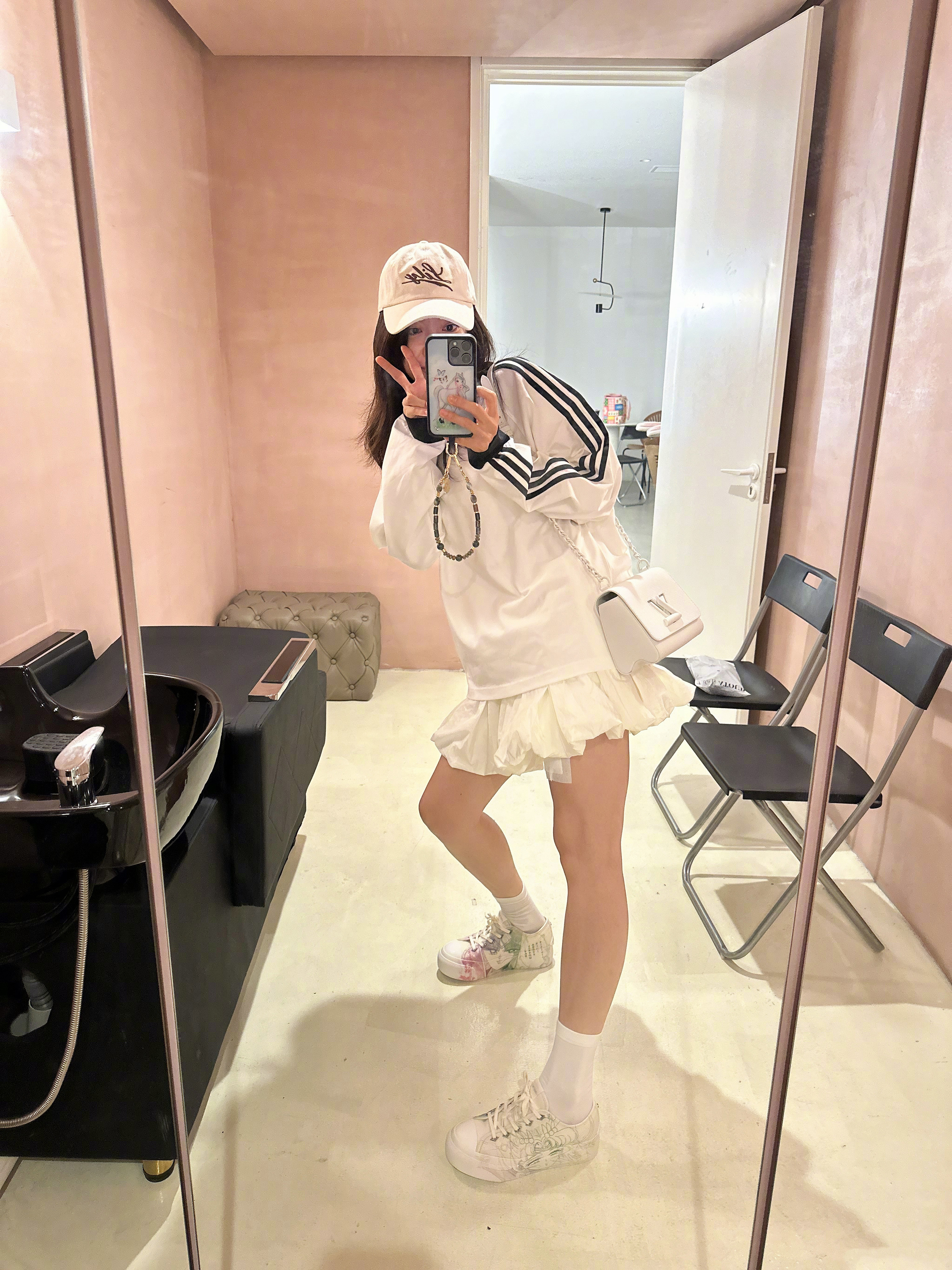 宋茜身穿短裙搭配白色袜子,整体造型青春活泼,展现出轻盈的时尚感。